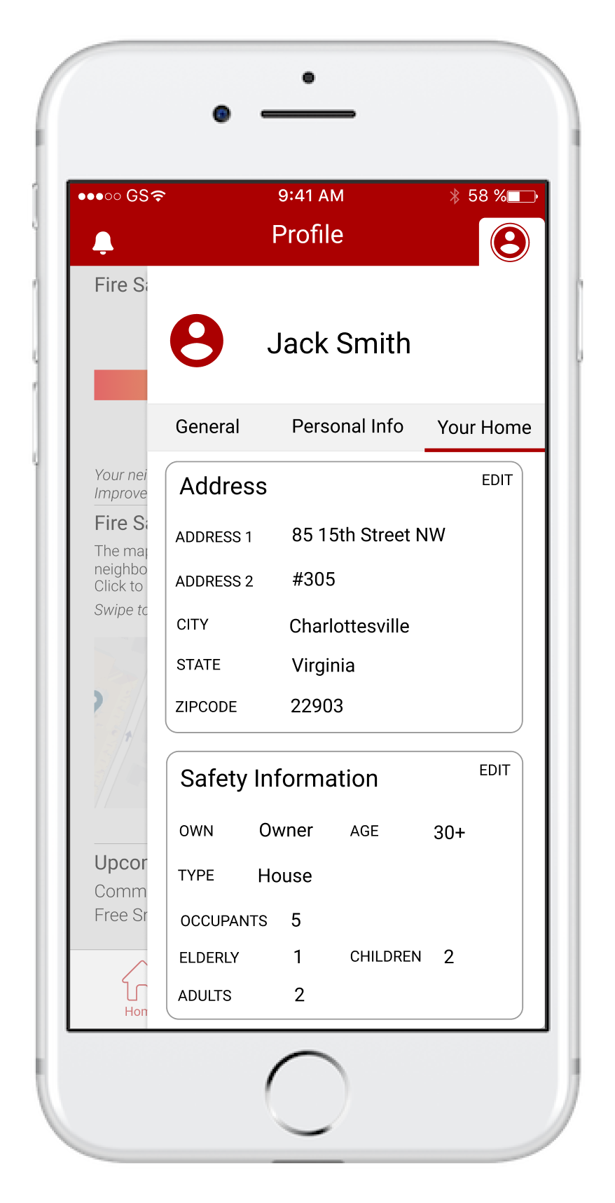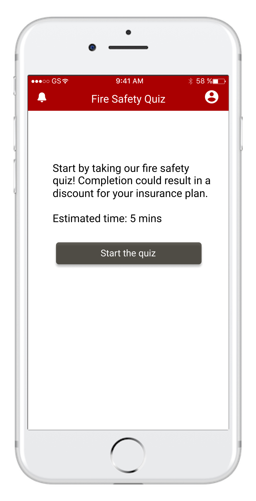 A main component of applications that try to change user's behavior is competetiveness. We have an innate compepitive nature which motivates us to do certain things or change our behaviors which is why we decided to play on this nature in order to make users more educated on fire safety. By having a safety score and an interactive map with your neighbors scores, the users can see how others are doing and be motivated to change their score. Additionally, by having an opportunity to get some sort of insurance break through a better score, this will also motivate the user to educate themselves as well.Design Process